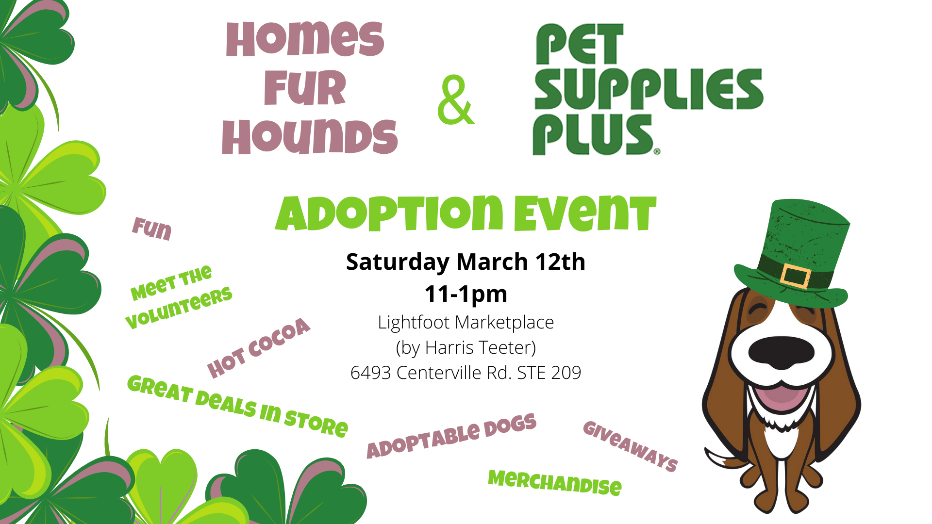 Homes Fur Hounds, Inc will be at the new Pet Supplies Plus in the Lightfoot Marketplace on Centerville rd. (by Harris Teeter) for an adoption event. We will have adoptable dogs, merchandise, giveaways, a hot cocoa bar, and much more. Meet our volunteers, Pet Supplies Plus staff, and stock up on some great deals and sales throughout the store. The event is inside, so come check it out. We are St. Patrick’s day themed…..so bring your green!