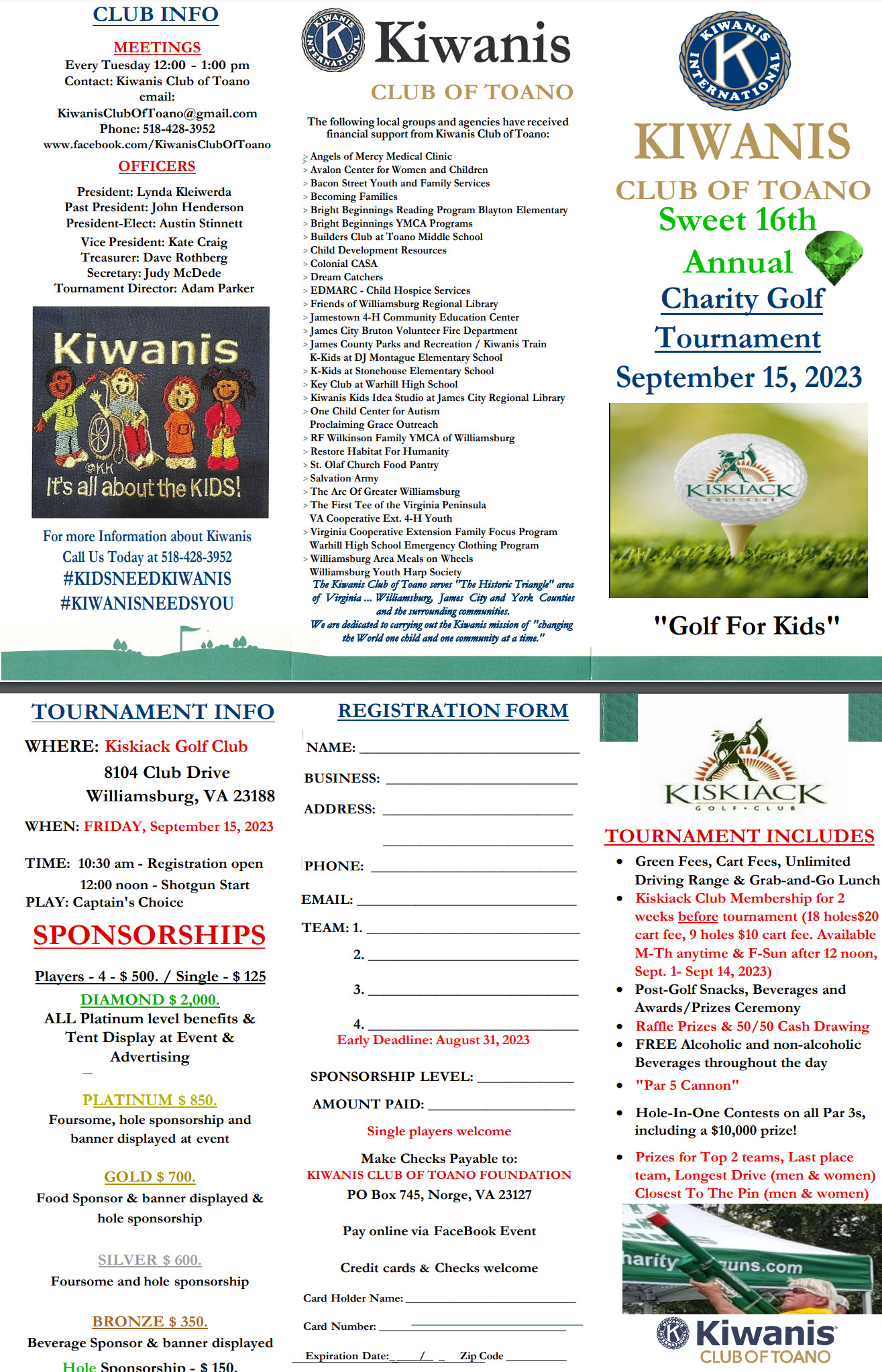 Annual Kiwanis Club of Toano Charity Golf Tournament to be held on Friday, September 15, 2023. This year’s fund-raising, charity tournament is being held at Kiskiack Golf Club, 8104 Club Drive, Williamsburg.