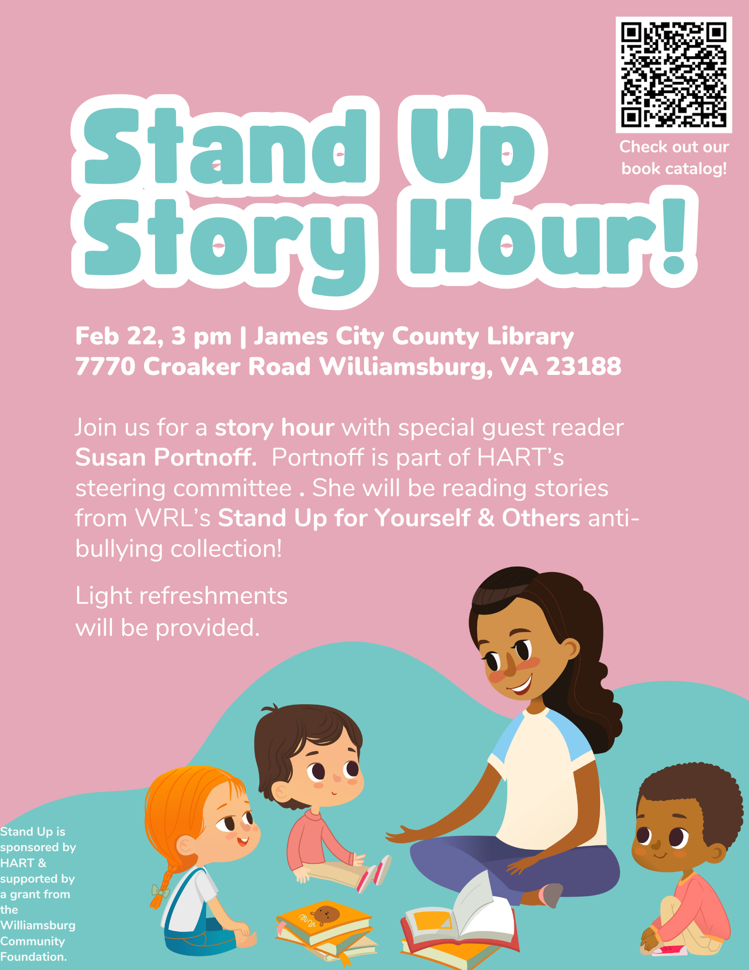 Bring your little ones to a story hour with a special guest reader. The guest reader will be reading from WRL’s Stand Up for Yourself & Others anti-bullying collection. This story hour is perfect for preschoolers! Snacks will be provided!