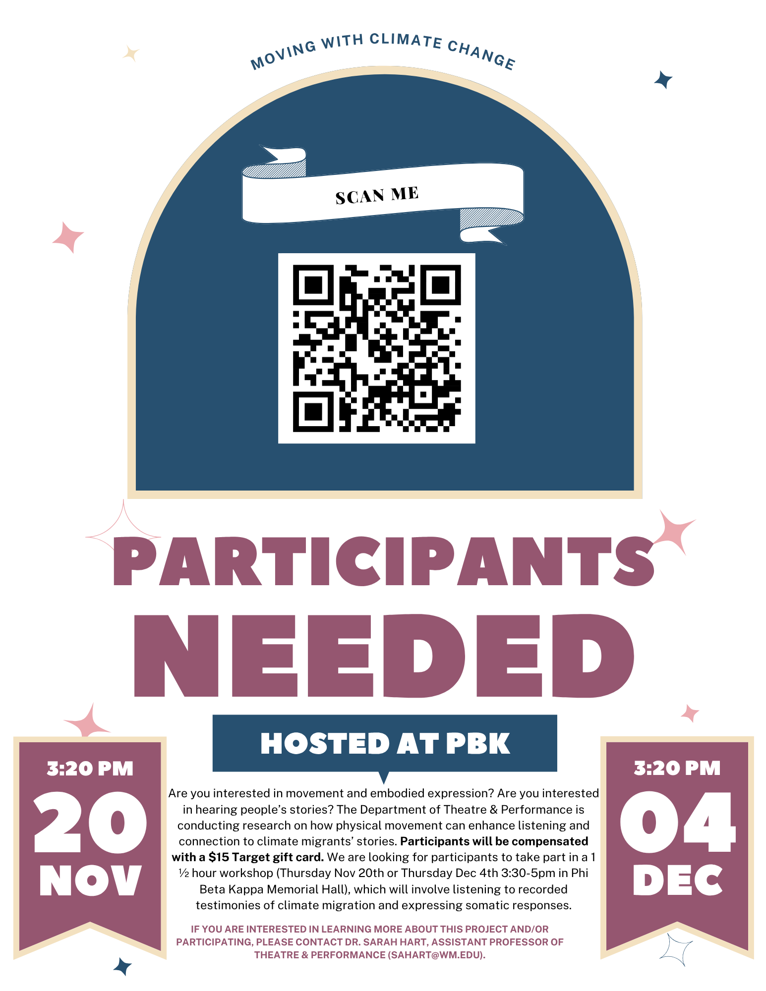 Are you interested in movement and embodied expression? Are you interested in hearing people’s stories? The Department of Theatre & Performance at William & Mary is conducting research on how...