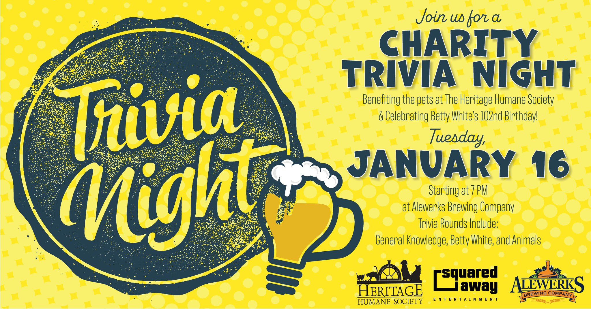 For those who love a good challenge for a great cause, come to the Betty White trivia night at Alewerks. It starts at 7 PM and the questions will be: General Knowledge, Betty White, Golden Girls, and Animals.