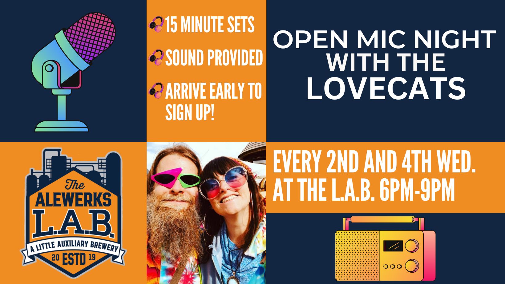 Check out Open Mic Night at the L.A.B. Wednesday night with the Lovecats. It’s free to participate, and free to watch! If you’re looking to perform, be sure to show up early so you can sign up. Performers are given 15 minute sets and sound is provided. Open Mic Night is about exploring new music, supporting friends, and making new friends!
