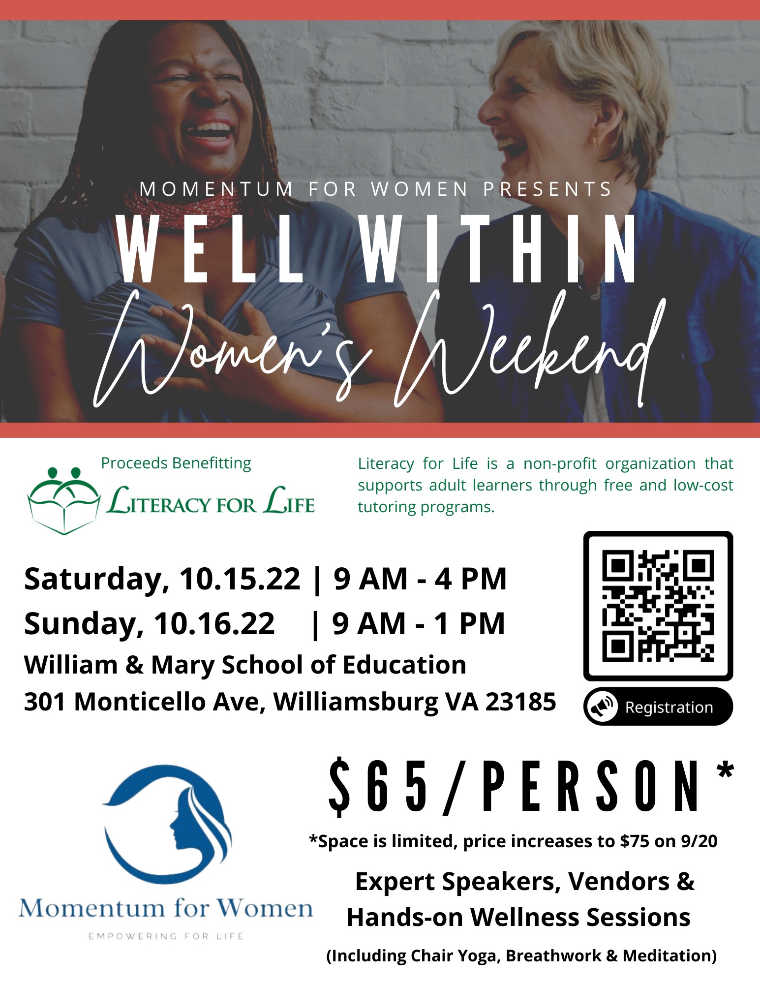 This inaugural event will feature dynamic female speakers on a wide range of important health and lifestyle topics, as well as local vendors, chair yoga, meditation, a raffle, door prizes and more! Proceeds benefit Literacy for Life. Questions? Email momentumforwomenwmbg@gmail.com.