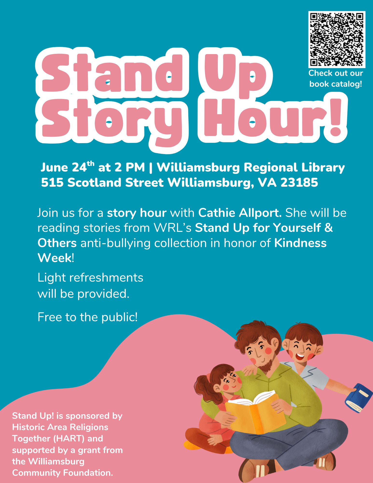 Join us for a story hour with Cathie Allport. In honor of Kindness Week, she will read stories from WRL’s Stand Up for Yourself & Others anti-bullying collection.